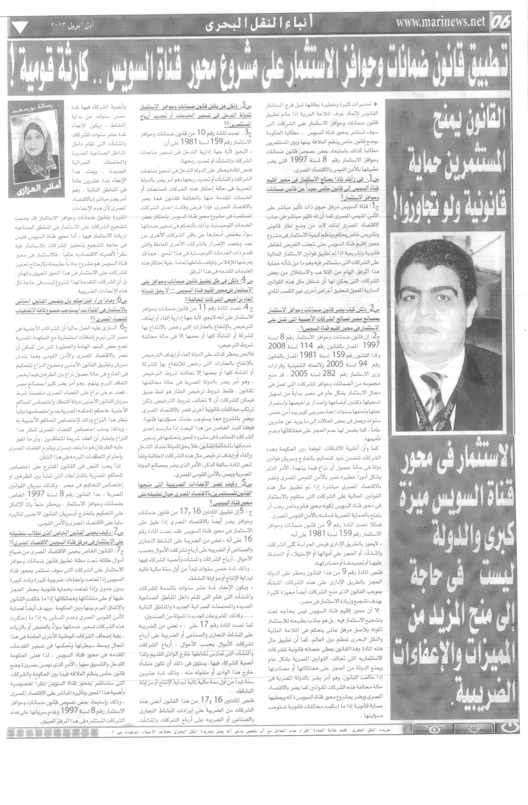 An Interview with Mr. Nabil Farag concerning, “Applying the Investment Law on Suez Canal Axis Project” describing such an act as being “Nothing But …