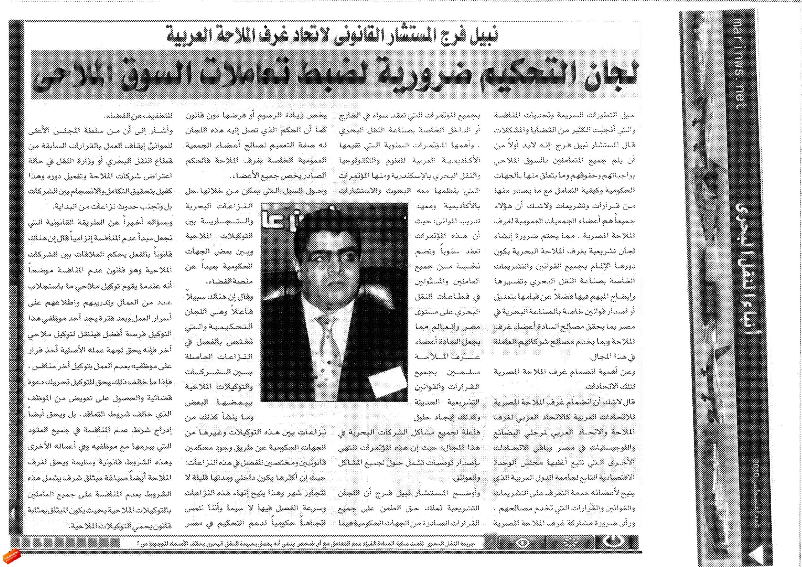 The importance of arbitration committees to control the shipping market transactions and the importance of the joining of Egyptian Chambers of Shipping to the Arab unions .