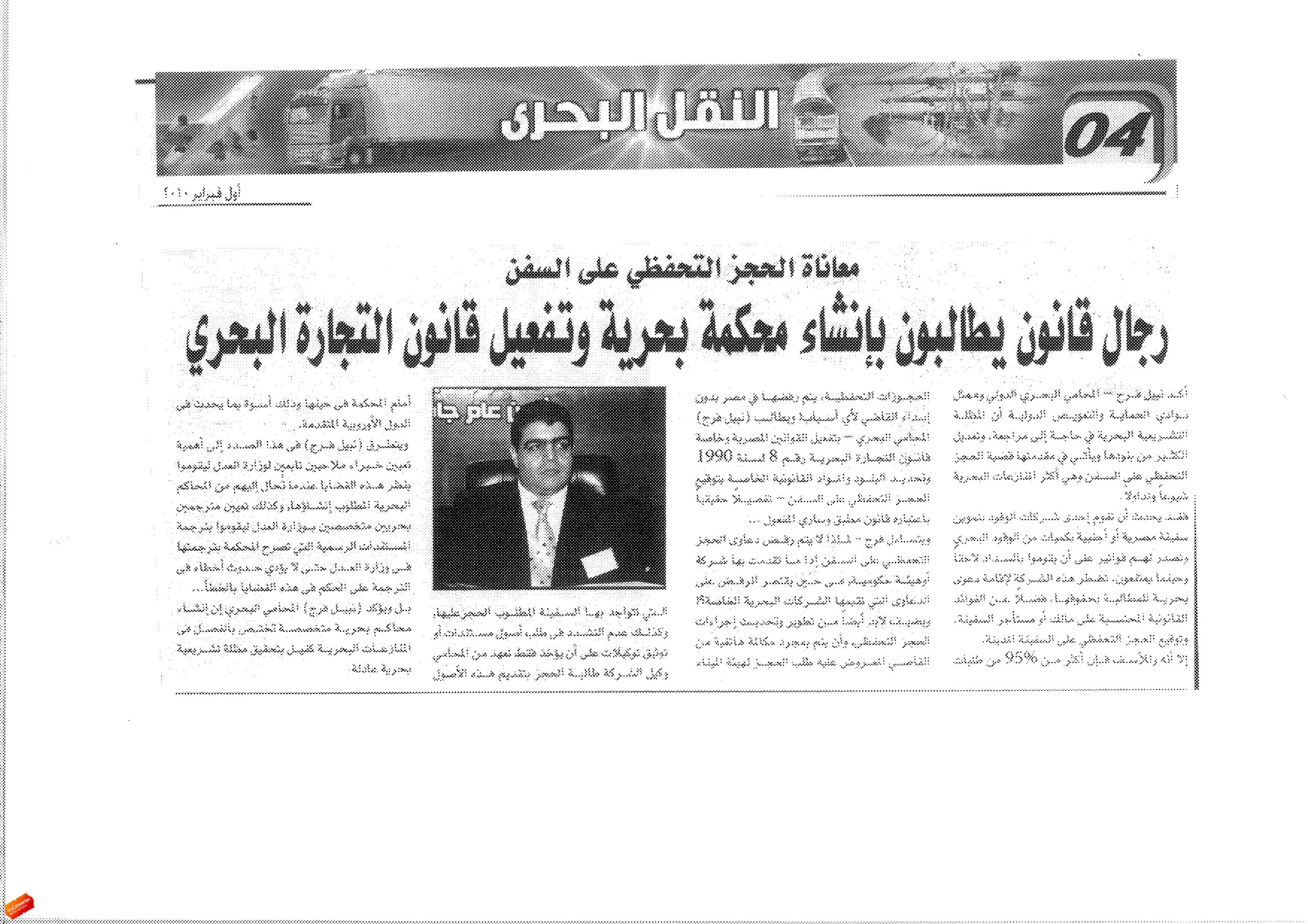 The suffering of arrested vessels Mr.Nabil farag , the international maritime attorney calls for the establishment of a maritime court and for activating the law of the maritime trade .