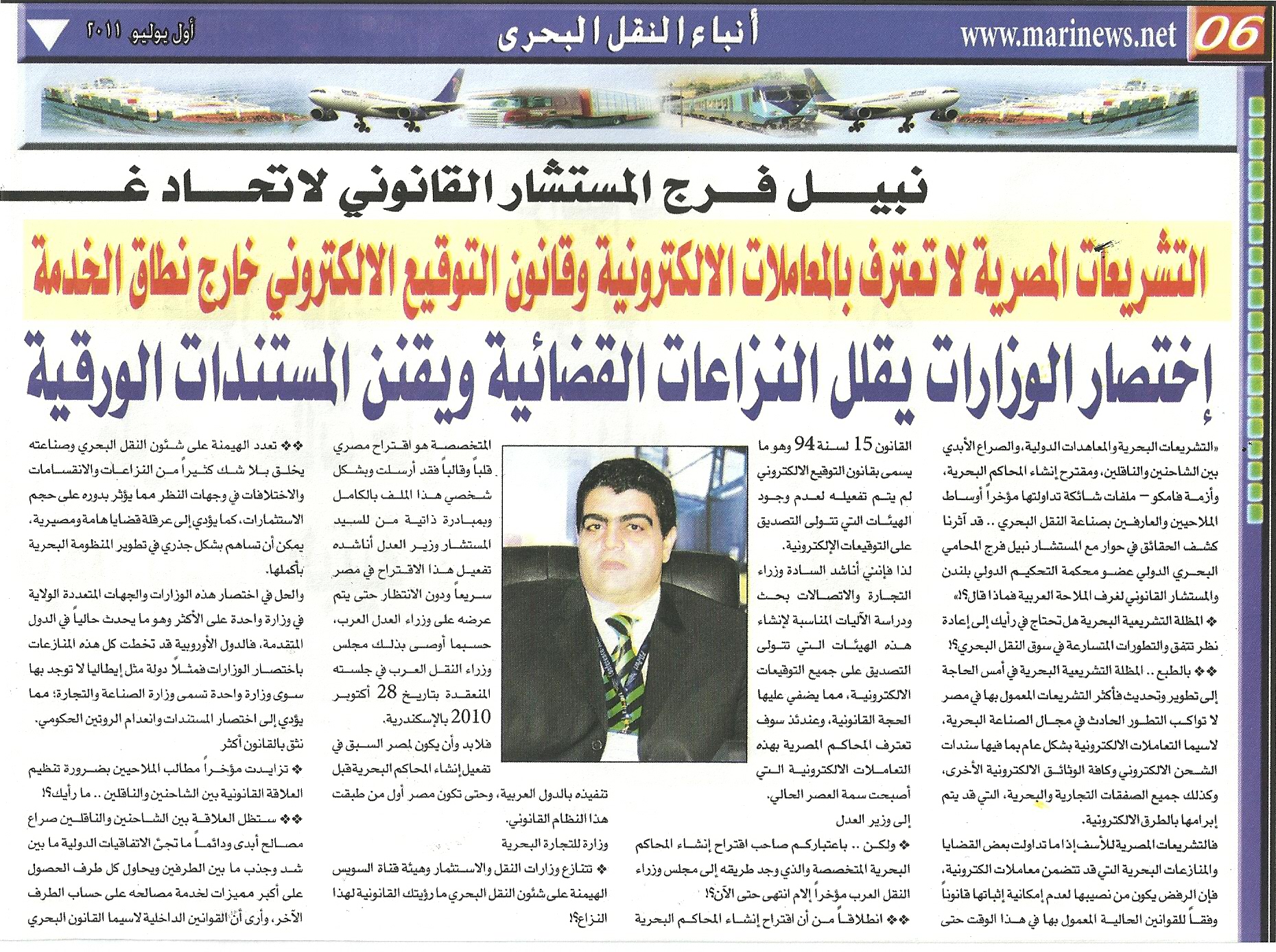 Mr.Nabil Farag asserts that the Egyptian legislation does not recognize electronic transactions , he calls for activating the electronic signature law and he believes that abbreviation of ministries will reduce legal disputes and will codify the paper documents .