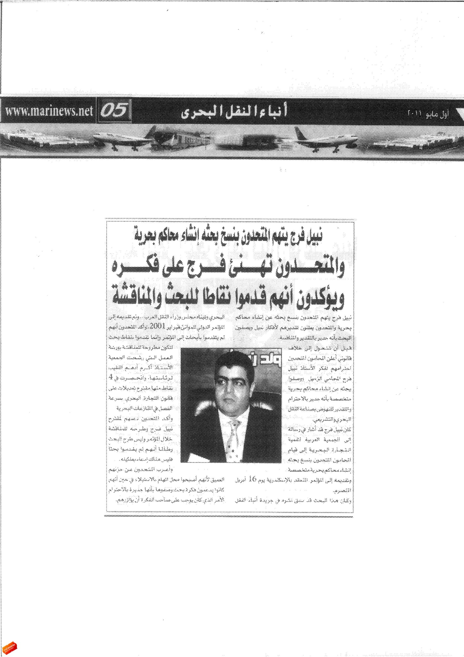 Mr.Nabil Farag accuses the united attorneys because the copied his research about establishment specialized maritime courts, but they congratulate him for his ideas and stress that they gave only points for discussion and debate including proposed amendments to the law of maritime trade .