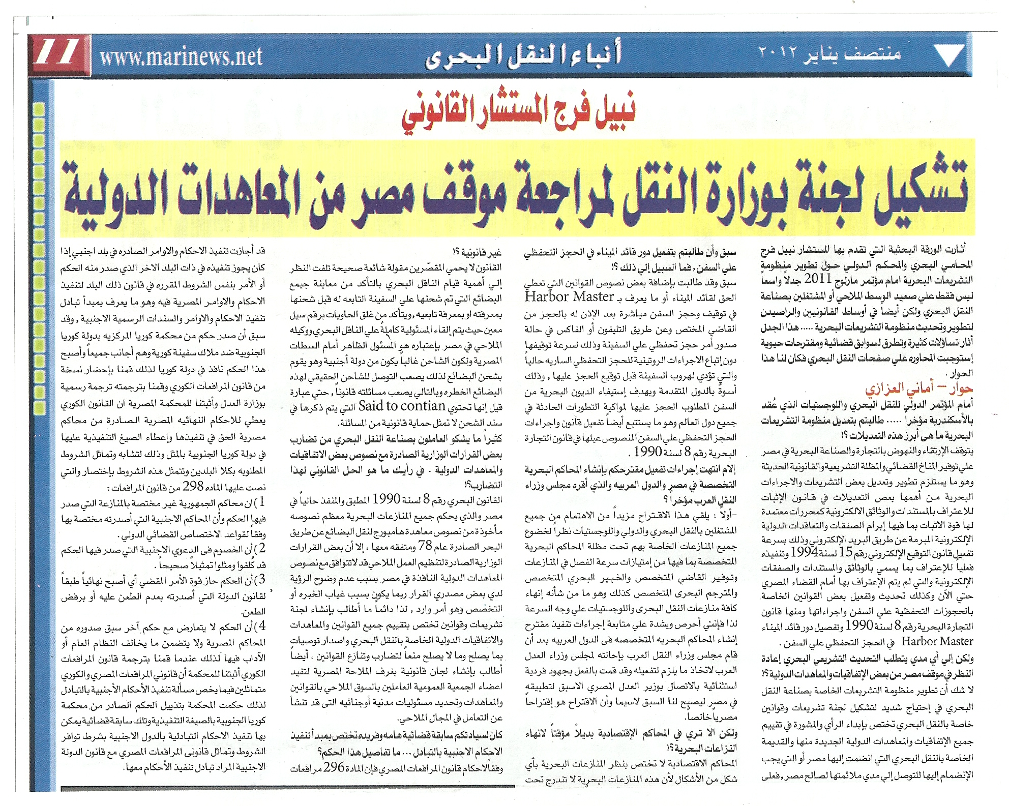 An Interview with Mr. Nabil Farag concerning, “The formation of a committee at the Ministry of Transport to review Egypt’s position towards international treaties”