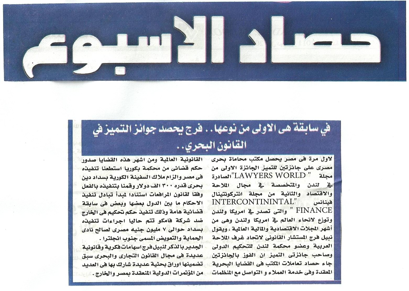 In an event which is the first of its kind : Mr.Nabil Farag won two awards of Distinction in the field of the maritime law, the first is from LAWYERS WORLD MAGAZINE in London and the second from INTERCONTININTAL FINANCE MAGAZINE in USA and in London .